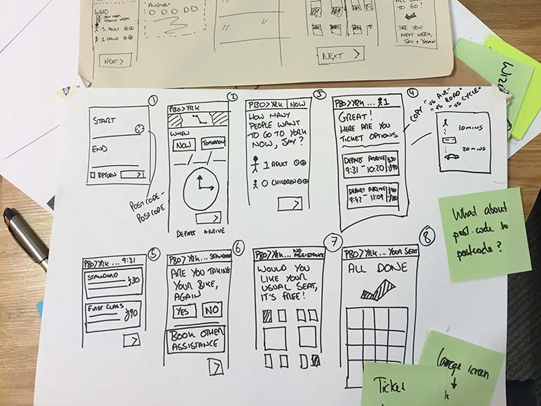 Within the early stages of the project, we were able to map a service proposition through a series of low fidelity mock ups. This was done as a team activity so that everyone had a chance to pitch their own ideas and have ownership of the final design solutions. The sketches created were of key digital and physical touch points that both staff and customers would experience. These included the kiosk booking journey, sign posting to help travellers flow within the station and displays to be placed along platforms that will help better distributed people boarding the trains.