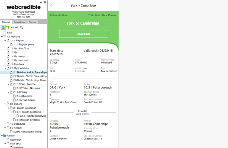 To explore digital concepts that could replace traditional paper tickets, mobile prototypes was created to test various approaches. These Axure prototypes were preinstalled on to mobile devices (iOS and Android) so that participants could assess their suitability whilst navigating around the stations and onboard the trains themselves.